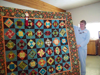 | Betty Watt and Debbie Miles showing off the quilt they helped construct. |